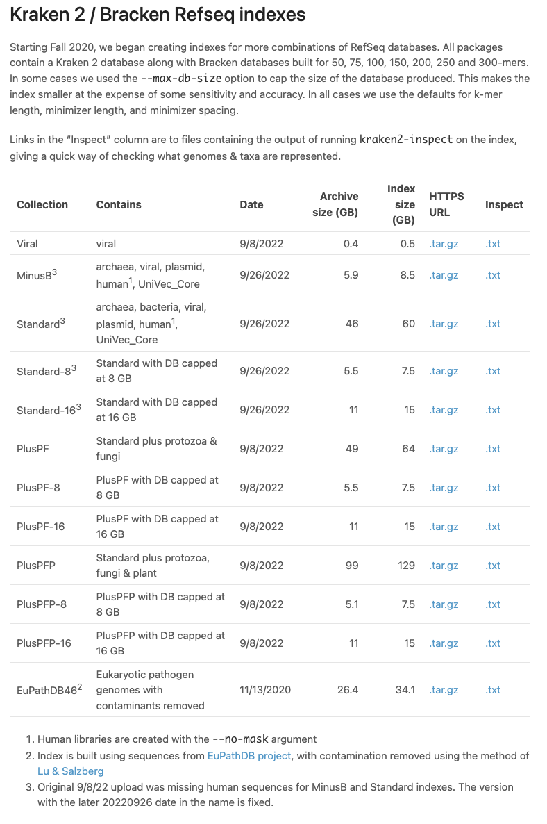 Kraken 2 database (Standard 46G) includes archaea, bacteria, viral, plasmid, human1, UniVec_Core has been downloaded in below from https://benlangmead.github.io/aws-indexes/k2 We already linked decompress database by ln command above.