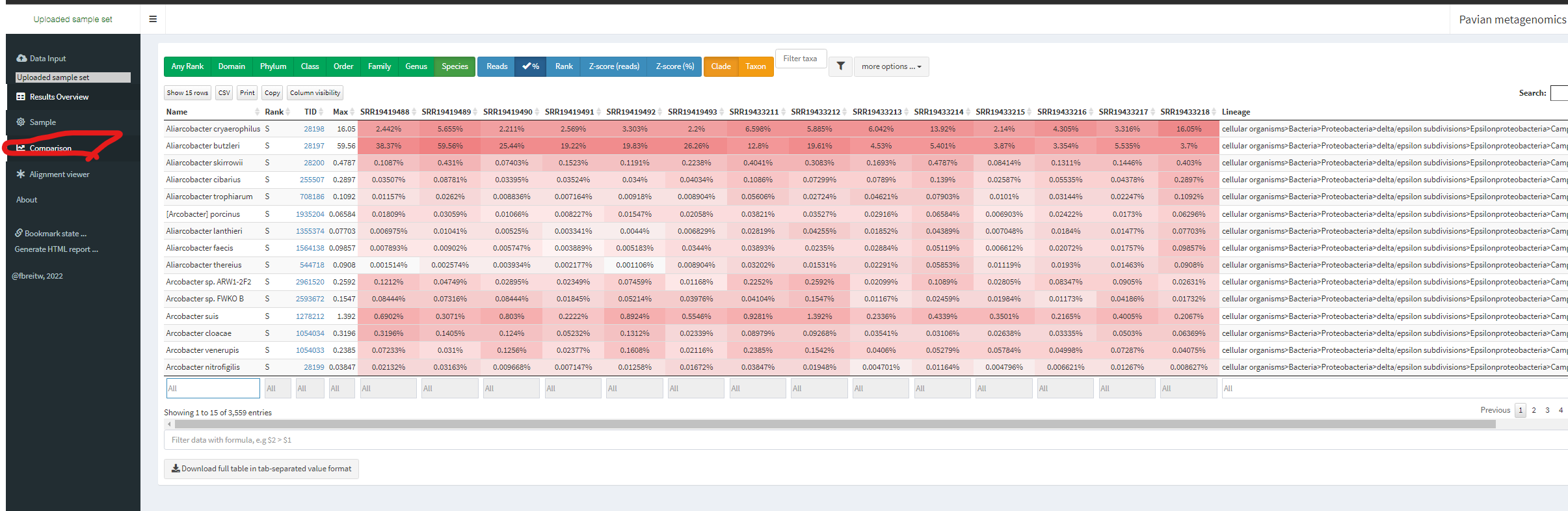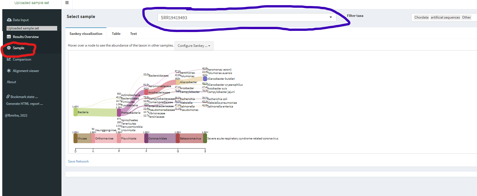 By click Comparison on your left (RED circle), which sample includes the highest fraction of Severe acute respiratory syndrome-related coronavirus