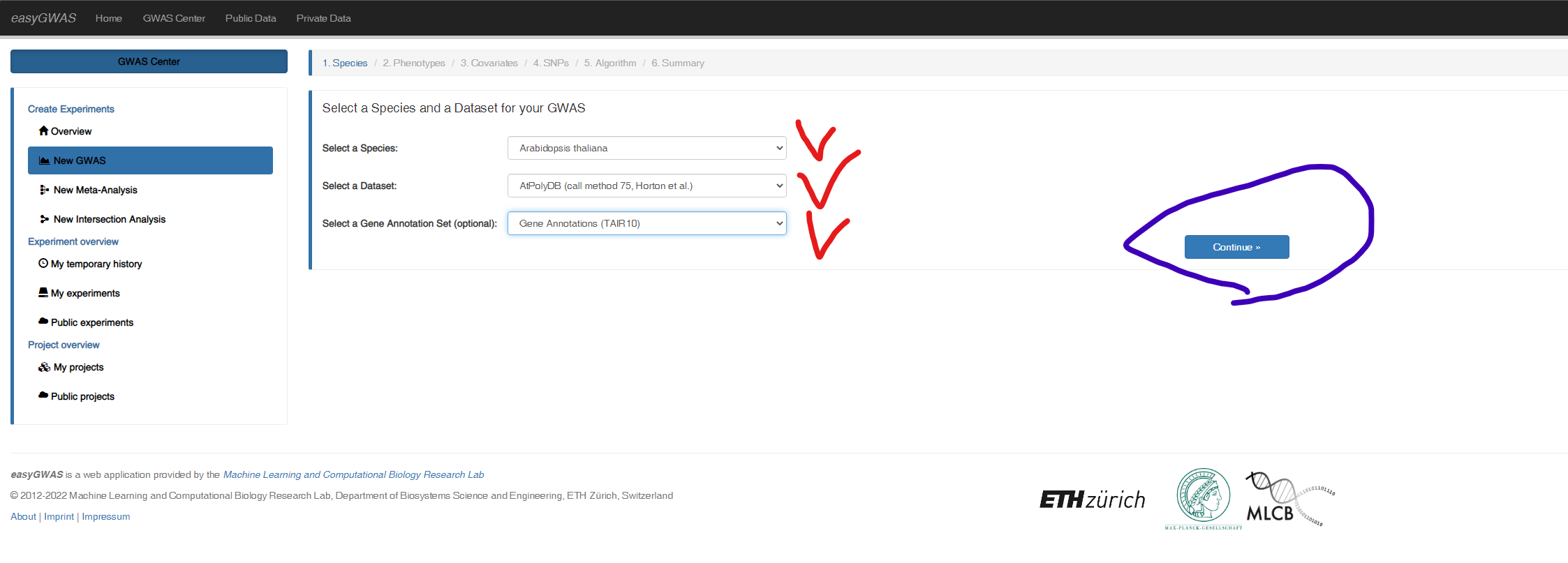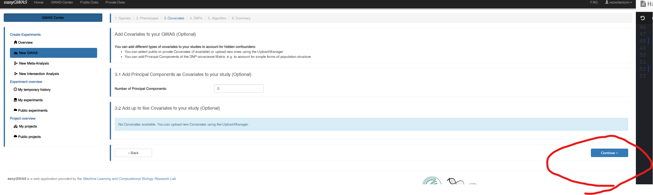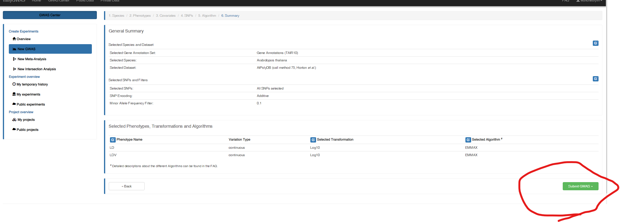In the last step we are asked to confirm if all the parameters we chose for our analyses are correct. We can always adjust them, if necessary. Finally, we can submit our GWAS to the computation servers by clicking Submit GWAS.