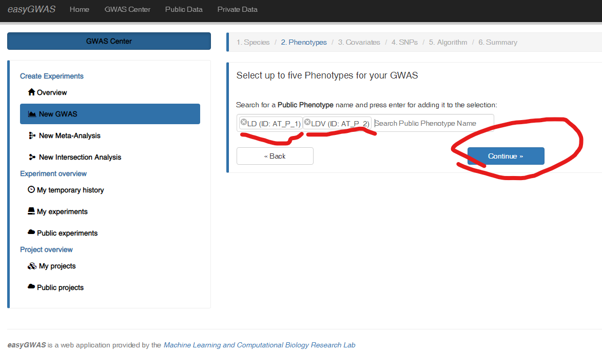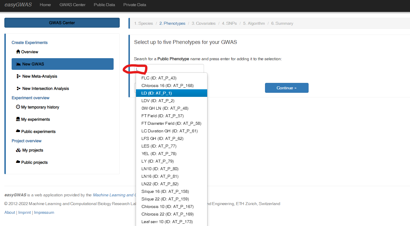 In the second step we have to select a Phenotype. Here we have the choice to select publicly available Phenotypes or private ones (if available) by searching the name of the phenotype using the autocompletion field. We can select a total of 5 Phenotypes. For this tutorial we select the two Phenotypes LD and LDV by typing their names. Then click Continue. Select phenotype, if you type