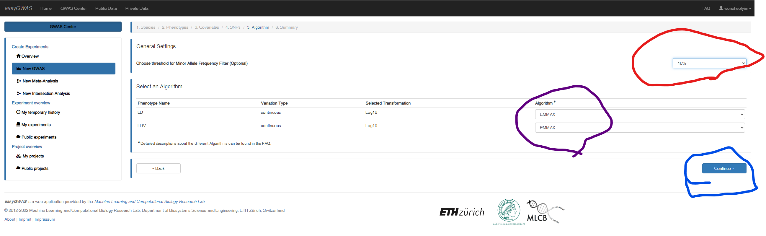 Next we have to choose the algorithms and filters we would like to use for our analysis. First we select a Minor Allele Frequency Filter of 10%. Next we select, for each Phenotype, the algorithm EMMAX and click Continue.