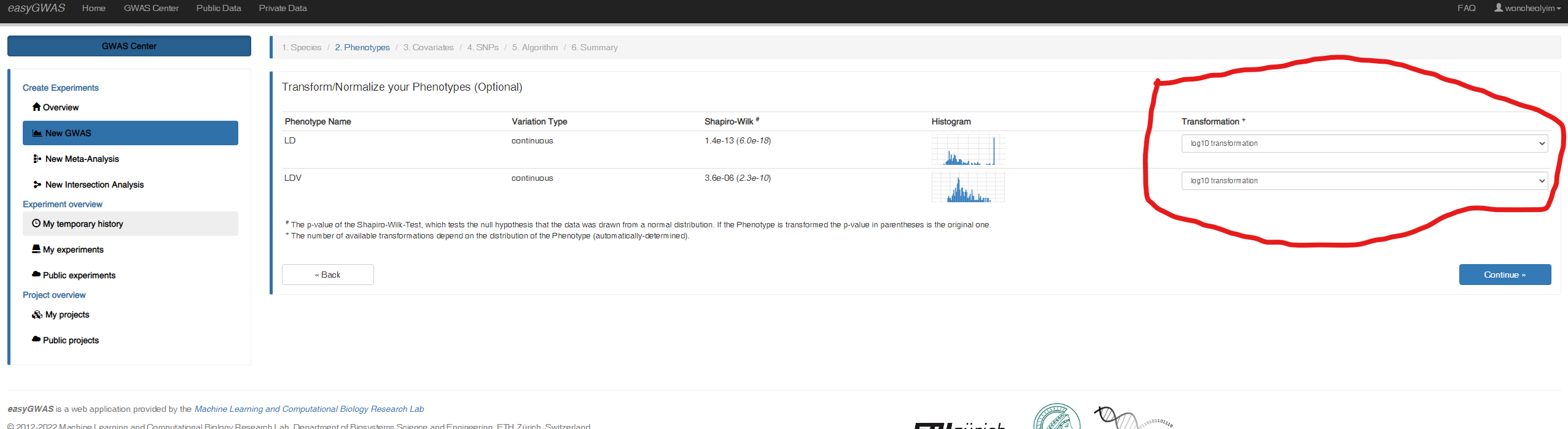 In the following view we can see histograms of the phenotypic distributions and a p-value from the Shapiro-Wilk test. The Shapiro-Wilk-Test tests the null hypothesis that the data was drawn from a normal distribution. Here we can transform the phenotype by applying a transformation to the phenotype. The number of available transformations is automatically-determined and depends on the distribution of the selected Phenotypes. For our selected Phenotypes we choose a Log10 transformation and click Continue.
